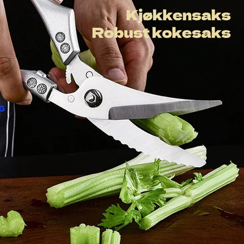 Kraftige kjøkkensakser er hovedsakelig laget av høykvalitets blader i rustfritt stål og håndtak av aluminiumslegering, blader i rustfritt stål, skarpere, slitesterke og krøller seg ikke.