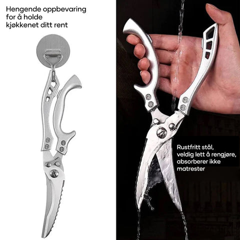 Skarpt område, sterkt område, skrapskurområde og flaskeåpningsområde, multifunksjonell sameksistens, en saks og multifunksjon. Egnet for å kutte bein, kylling, kjøtt, grønnsaker, enkel flaskeåpning, skraping av fiskeskjell.