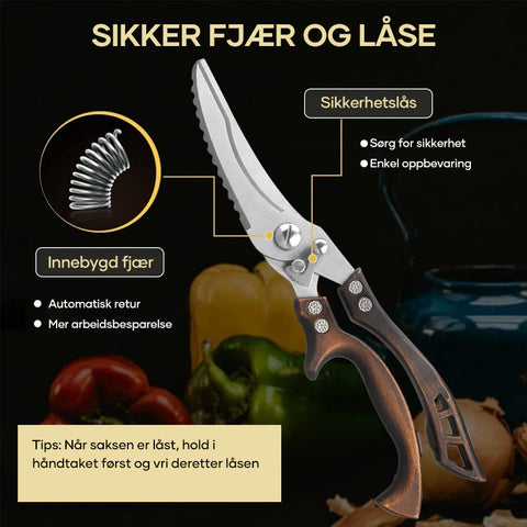 Kjøkkensaks har en innebygd fjær som automatisk fjærer tilbake. Det er ikke lett å spre eller bryte under bruk, noe som kan redusere trykket på hånden og er mer behagelig og arbeidsbesparende.